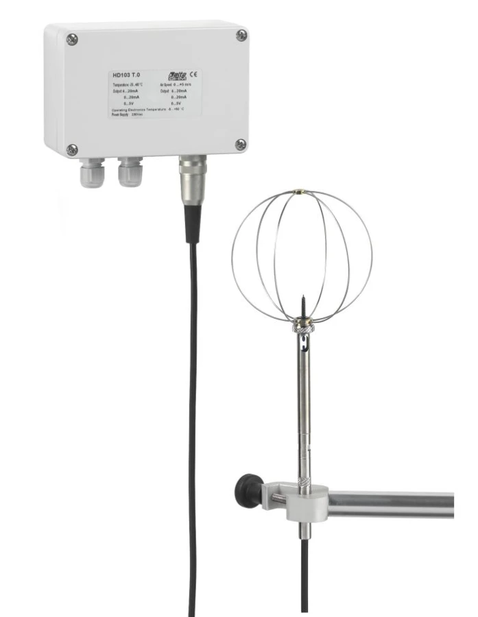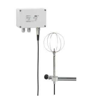 Aktywny przetwornik prędkości powietrza z wielokierunkowym czujnikiem z gorącym drutem (termoanemometrycznym). Sonda z drucianym, sferycznym koszykiem ochronnym o średnicy Ø 100 mm, podłączona do układu elektronicznego za pomocą 5-metrowego kabla.