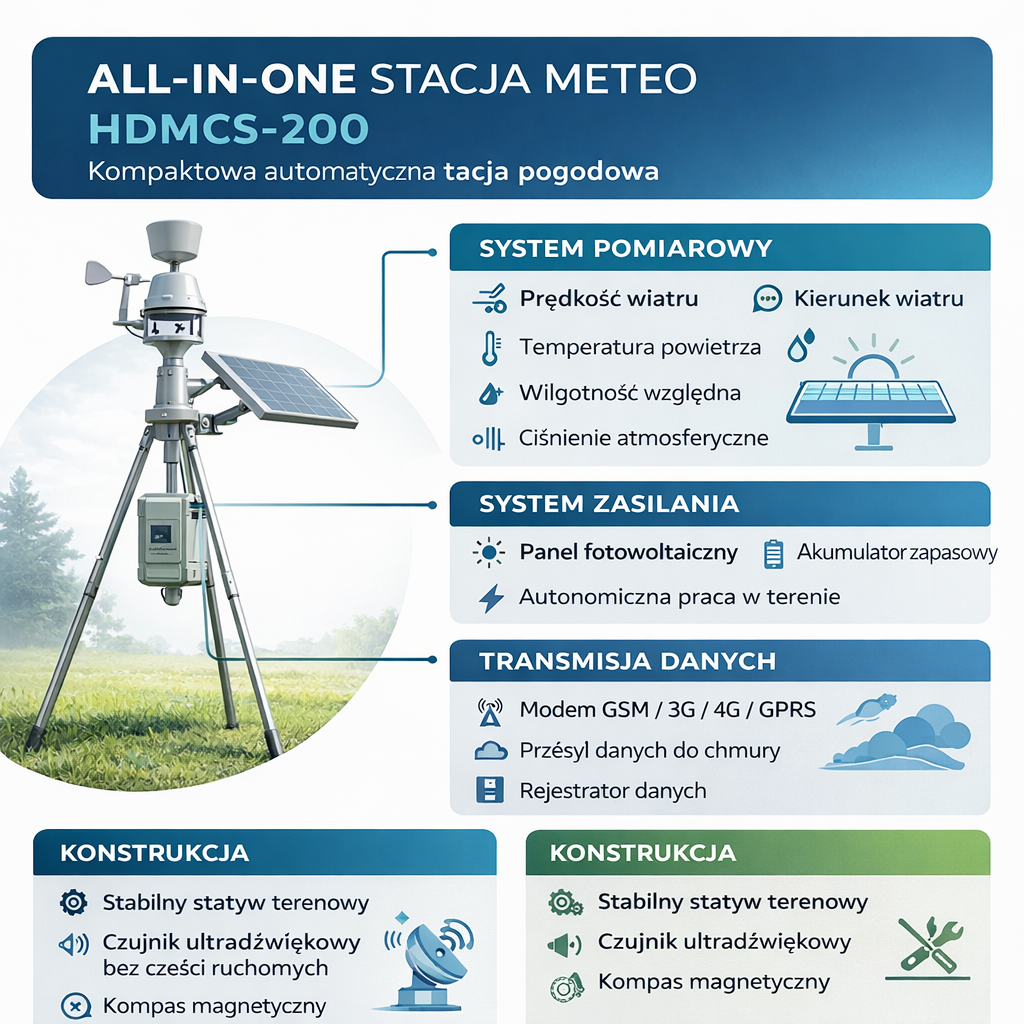 HDMCS-200 to zaawansowana, zintegrowana stacja meteorologiczna "All-in-One", zaprojektowana do najbardziej wymagających zastosowań badawczych i przemysłowych. W porównaniu do wersji podstawowej, model 200 oferuje rozszerzony zakres pomiarowy oraz wyższą dokładność sensorów, zachowując pełną autonomię energetyczną (panel słoneczny) i komunikacyjną (modem 4G).
